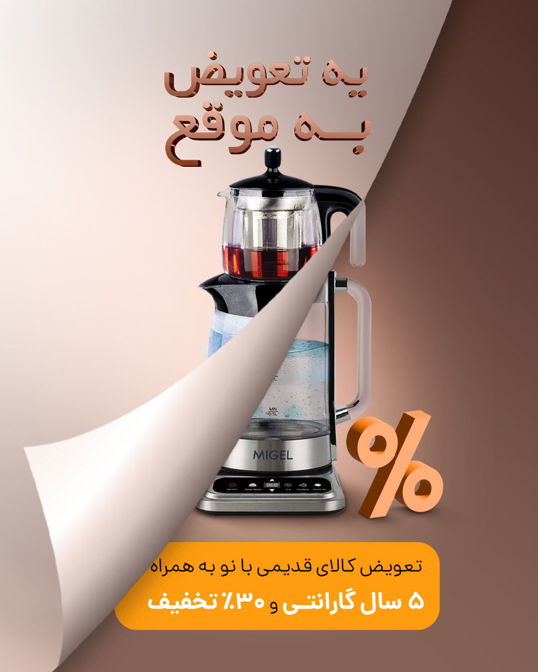 کافیه کالای قدیمی یا آسیب دیدهی خودتون رو به ما بسپرید و یک کالای نو با ۳۰٪تخفیف و ۵ سال گارانتی دریافت کنید.